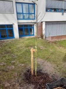 Am Donnerstag pflanzte Frau P. Meier mit großer Unterstützung der Zweitklässler*innen zwei schöne Apfelbäume auf unserem Schulgelände. Die Erdmännchen und die Eisbären aus den 2. Klassen, die sich im Sachunterricht im Vorfeld ausführlich mit dem Apfel beschäftigt hatten, konnten unter Anleitung alle Arbeitsschritte selbst erledigen.